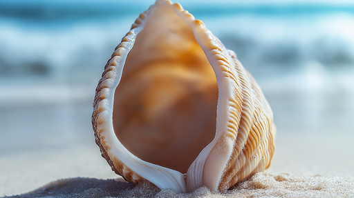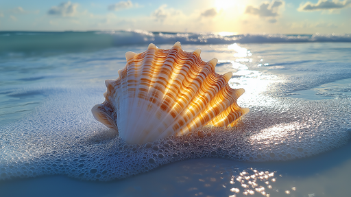 Este magnífico papel de parede mural destaca uma concha delicadamente iluminada pela luz dourada do pôr do sol, em um cenário de uma praia tranquil...
