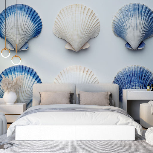 Papel de parede mural concha do mar | Elegância marinha em fundo azul