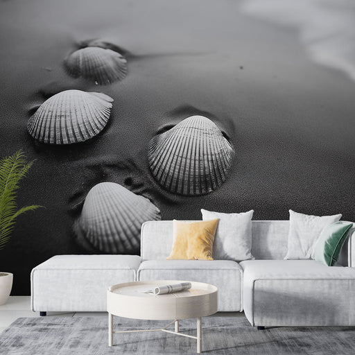 Este papel de parede mural apresenta um padrão calmante de conchas brancas, harmoniosamente dispostas em um fundo de areia preta. A combinação eleg...