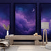 Ideal para criar um ponto focal em uma sala de estar, quarto ou escritório, este papel de parede evoca tranquilidade e escape. Os tons ricos de roxo e azul se misturam perfeitamente com móveis de madeira ou acessórios metálicos brilhantes, oferecendo uma bela atmosfera noturna.