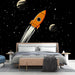 Este cativante papel de parede mural apresenta um foguete laranja em pleno voo, cercado por planetas e estrelas cintilantes que evocam a vastidão do universo. O fundo preto profundo realça os detalhes brilhantes, criando uma atmosfera dinâmica e moderna.