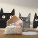 Descubra nosso papel de parede mural adornado com três gatos estilizados, cada um com um caráter único, trazendo um toque lúdico e fantasioso ao seu interior. Os gatos são desenhados em um estilo gráfico minimalista, com contornos ousados e olhos redondos expressivos, em um fundo bege suave que equilibra o design.