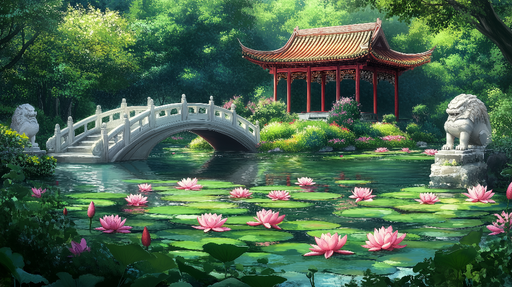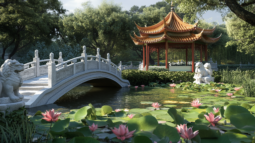 Ver todos os detalhesPapel de parede jardim zen | Ponte de pedra e lótus