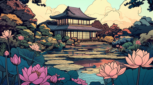 Ver todos os detalhesPapel de parede zen garden | Ambiente tranquilo com lótus e pavilhão