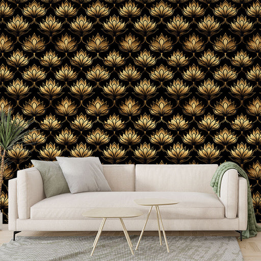 WonderMuralEste sofisticado Papel de parede apresenta um belo motivo de lótus dourado em um fundo preto profundo, trazendo um toque elegante e luxuoso ao seu ...