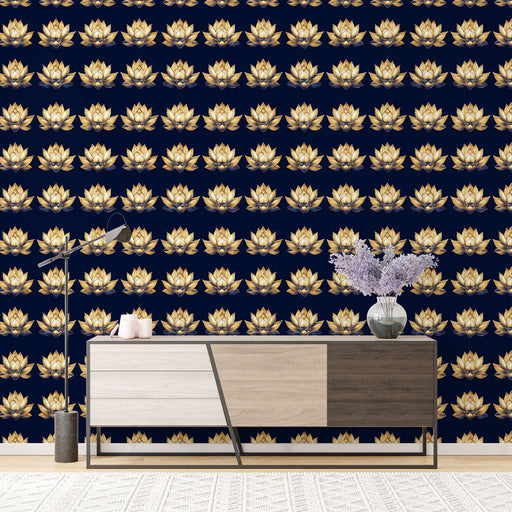 Papel de parede mural lótus dourado | Padrão de flores de lótus em tons de ouro em fundo azul escuro