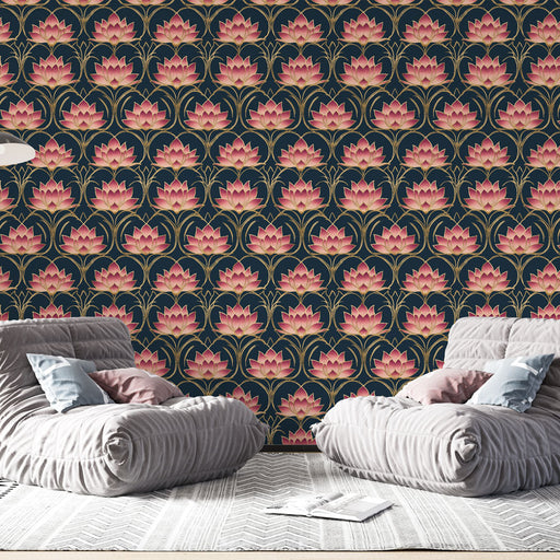 Ver todos os detalhesPapel de parede Lotus Flowers | Padrão floral elegante em um fundo azul meia-noite
