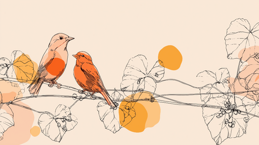 Ver todos os detalhesPapel de parede pássaros e folhas | Dois pássaros estilizados em uma videira com tons de laranja