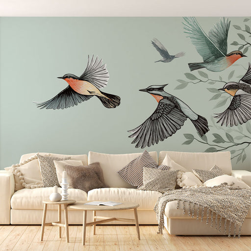 WonderMuralNosso super tapete de parede apresenta pássaros em voo, lindamente ilustrados com detalhes finos e cores vibrantes. O fundo verde pastel cria uma a...