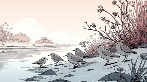Ver todos os detalhesPapel de parede pássaros | Plantas e pássaros ao longo de uma margem tranquila