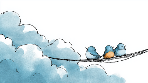 Ver todos os detalhesPapel de parede mural pássaros em um galho | Três pequenos pássaros coloridos pousados em um galho, cercados por nuvens