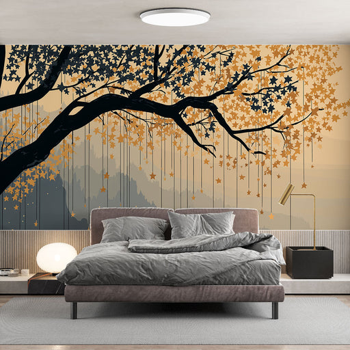 WonderMuralNosso excelente papel de parede mural apresenta uma árvore estilizada com folhas douradas penduradas em formas de estrela, criando uma atmosfera de...