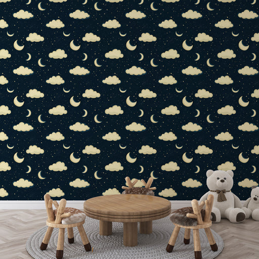 Ver todos os detalhesPapel de parede mural noite estrelada | Um céu noturno adornado com nuvens e luas crescentes