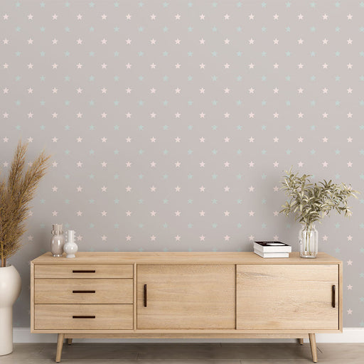 Studio SamaDescubra nosso papel de parede mural estrelas com um fundo cinza suave, adornado com padrões delicados de estrelas em branco e azul claro. Este pap...