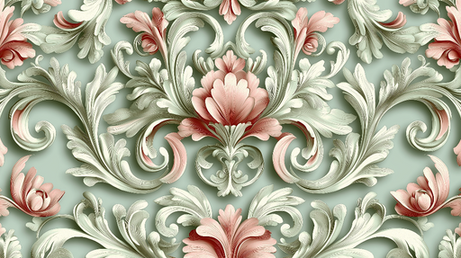 WonderMuralEste papel de parede mural apresenta um elegante padrão barroco, combinando tons delicados de rosa e verde em um fundo suave. Os redemoinhos e flor...
