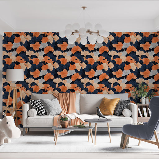 WonderMuralEste exclusivo papel de parede apresenta um padrão elevado de folha de ginkgo, com tons vibrantes de laranja, azul e creme em um fundo escuro. A co...