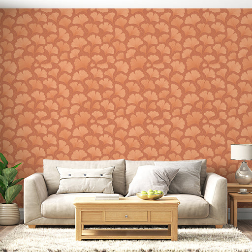WonderMuralEste papel de parede apresenta um elegante padrão de folha de ginkgo em tons de laranja e pêssego, criando uma atmosfera calorosa e acolhedora. O f...