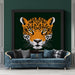 Este papel de parede mural apresenta um design ousado com uma magnífica cabeça de jaguar, ilustrada com detalhes realistas e cores vibrantes de laranja e preto. O contraste com o fundo verde escuro acentua a intensidade do padrão, criando uma atmosfera que é ao mesmo tempo selvagem e sofisticada.