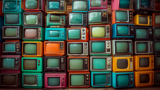 Art'loloEste retro Papel de parede Mural destaca uma coleção de televisões vintage coloridas, oferecendo uma verdadeira viagem ao passado. Perfeito para de...