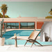 Descubra nosso papel de parede representando uma casa moderna com uma encantadora piscina. Este design estilizado mostra arquitetura contemporânea, cercada por exuberantes palmeiras, criando uma atmosfera de luxo e relaxamento. Os tons suaves de rosa e azul trazem um toque fresco e calmante, ideal para iluminar o seu interior.