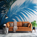 Este papel de parede mural apresenta um design moderno e calmante, com sombras de folhas de palmeira cortando delicadamente uma superfície branca. Os tons de azul criam uma atmosfera calma e refrescante, trazendo um toque de natureza para o seu interior.