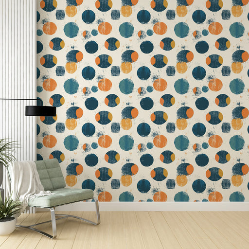 WonderMuralEste papel de parede apresenta um padrão cativante de círculos em tons vibrantes, combinando tons de azul, laranja e creme. Círculos de tamanhos e ...