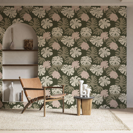 WonderMuralEste papel de parede apresenta um charmoso padrão de folhas tropicais e delicadas flores em tons pastel em um fundo verde oliva, trazendo uma atmos...