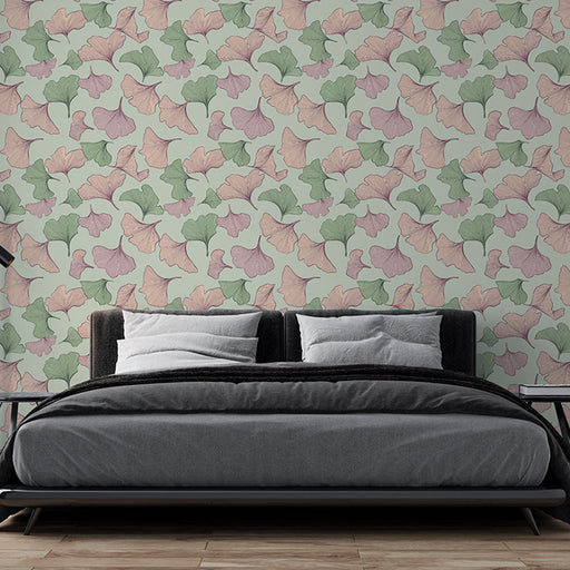 WonderMuralEste papel de parede apresenta um padrão refinado de folhas de ginkgo em tons suaves de verde e rosa, criando uma atmosfera tranquila e elegante. O...