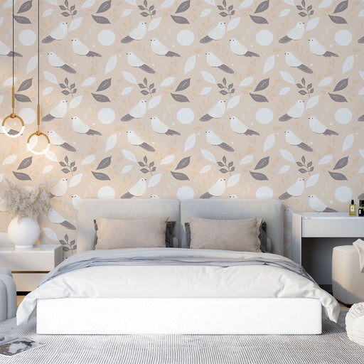 Papel de parede pássaros e folhas | Padrão encantador de pequenos pássaros e folhagem em tons pastel