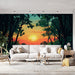 Este papel de parede mural evoca um magnífico pôr do sol através de uma densa floresta, onde as cores vibrantes do céu se misturam com as sombras das árvores. Os tons quentes de vermelho, laranja e amarelo iluminam o horizonte, oferecendo uma atmosfera serena e contemplativa.