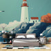Papel de parede mural farol-costeiro | Ilustração brilhante de paisagem marinha com farol e gaivotas
