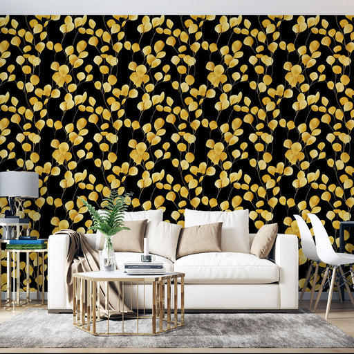 WonderMuralNosso papel de parede apresenta um belo padrão de folhas douradas cuidadosamente dispostas em um fundo preto intenso, criando um ambiente que é ao ...