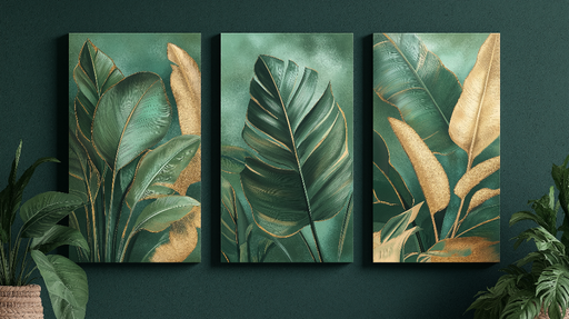 WonderMuralNosso papel de parede destaca um conjunto de folhas tropicais em tons ricos de verde e toques dourados, criando um efeito luxuoso que ilumina o amb...