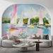 Os tons dominantes de azul e verde, acentuados por toques de rosa e amarelo, permitem que você brinque com várias paletas de cores na decoração circundante. Este papel de parede mural combina particularmente bem com acentos de madeira clara ou acessórios metálicos.