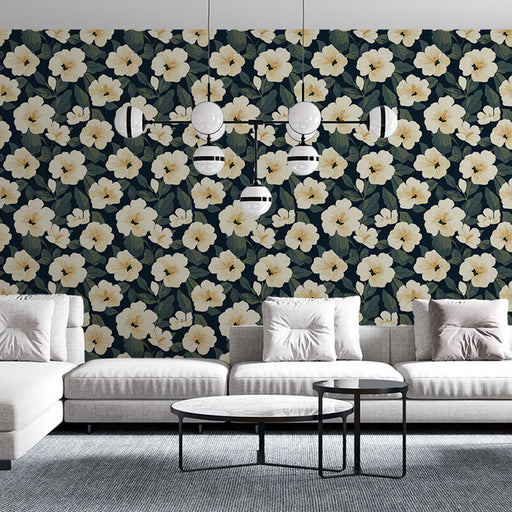 Ver todos os detalhesPapel de parede floral cremoso | Flores de hibisco em um fundo preto