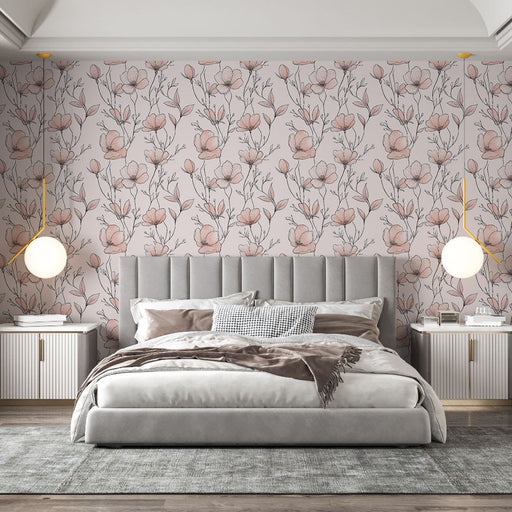 WonderMuralNosso incrível papel de parede mural evoca um charmoso padrão floral representando flores delicadas em tons suaves de rosa e bege, criando uma atmo...
