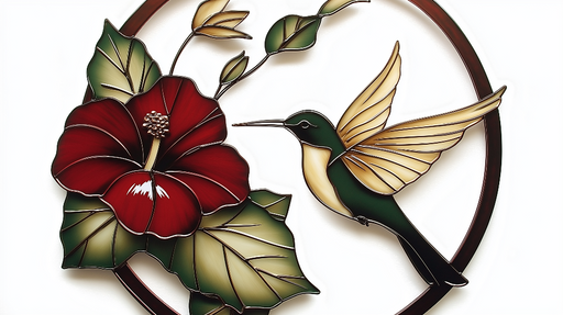Ver todos os detalhesPapel de parede beija-flor e hibisco | Peça elegante em metal colorido ilustrando um beija-flor e uma flor de hibisco