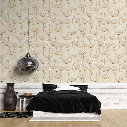WonderMuralEste papel de parede apresenta um padrão suntuoso de flores douradas de papoulas, sutilmente dispostas em um fundo preto profundo. As tonalidades d...