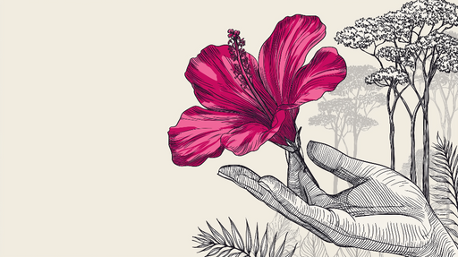 WonderMuralNosso super tapete de parede apresenta uma mão estilizada segurando um belo hibisco rosa, cercado por silhuetas de árvores e folhagens sutilmente d...