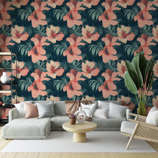 Ver todos os detalhesPapel de parede mural hibiscos | Um padrão vibrante de flores de hibisco em um fundo escuro