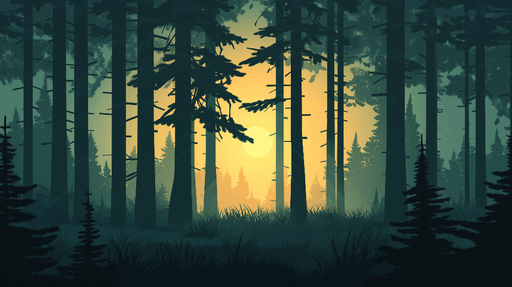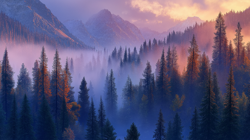 Ver todos os detalhesPapel de parede floresta mística | Uma paisagem encantadora de pinheiros sob um céu colorido