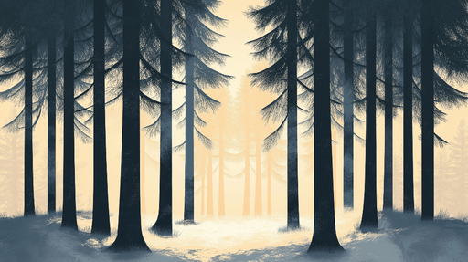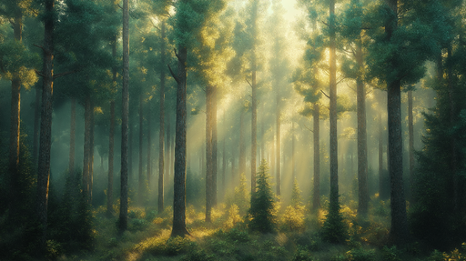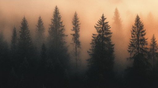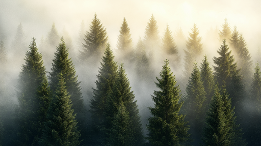 Papel de parede floresta-nevoenta | Uma paisagem de pinheiros destacando-se em uma suave luz dourada
