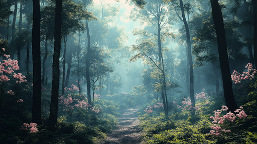 Ver todos os detalhesPapel de parede mural para floresta nebulosa | Caminho serpenteando por uma floresta mágica com flores cor de rosa