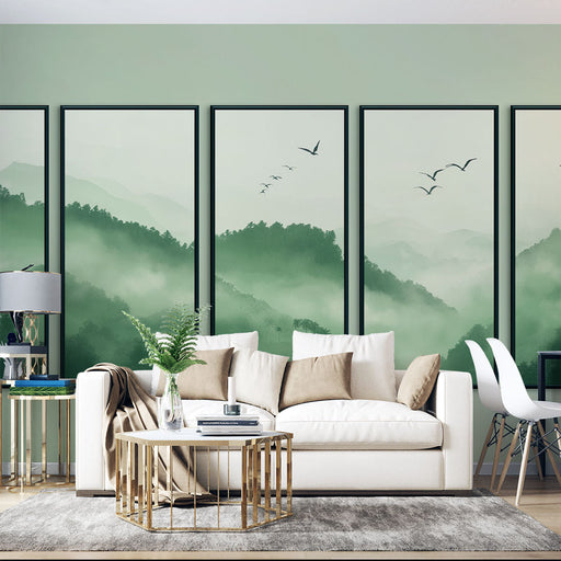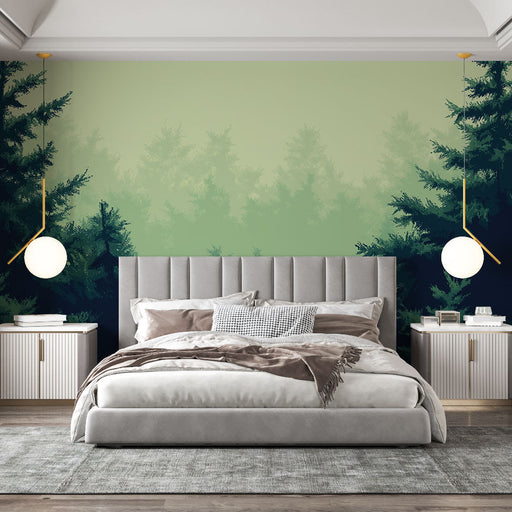 WonderMuralDescubra nosso papel de parede mural inspirado nas montanhas enevoadas, onde pinheiros verdejantes se destacam contra um fundo verde sutil. A atmos...