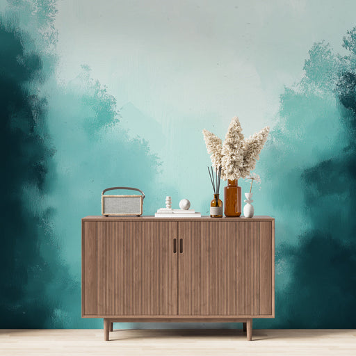 Ver todos os detalhesPapel de parede floresta enevoada | Paisagem suave com um toque de aquarela turquesa