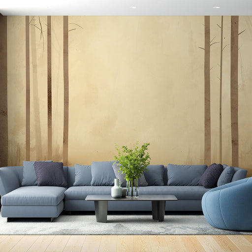 WonderMuralEste papel de parede evoca uma floresta nebulosa com suas árvores altas desenhadas em tons quentes de bege e marrom. O design minimalista traz uma ...