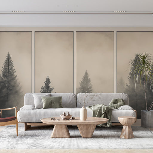 Ver todos os detalhesPapel de parede floresta enevoada | Design de pinho calmante em uma atmosfera etérea