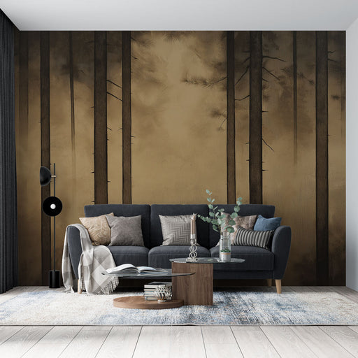 WonderMuralNosso exclusivo Papel de parede apresenta uma floresta misteriosa onde majestosas árvores negras se destacam em meio a uma névoa dourada. Os tons q...
