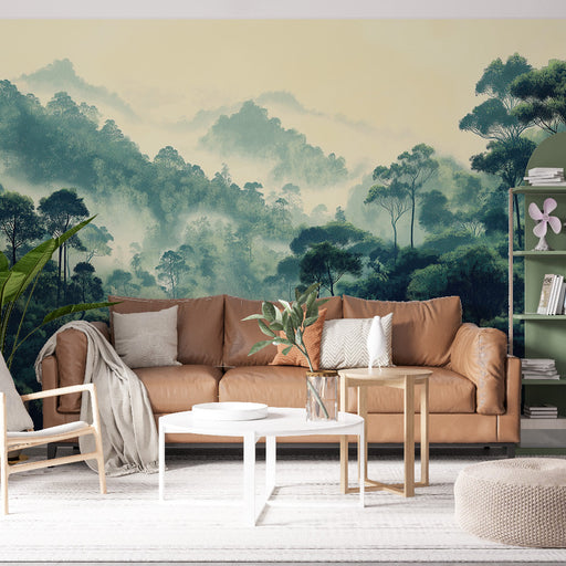 Ver todos os detalhesMural Wallpaper montanhoso | Paisagem enevoada com uma floresta exuberante