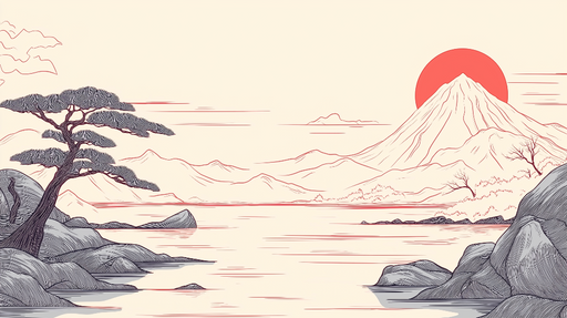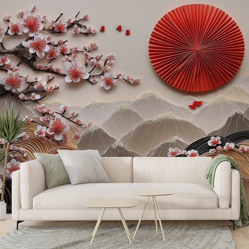 WonderMuralNosso papel de parede evoca uma paisagem tradicional japonesa calma, apresentando belas montanhas e um sol vermelho brilhantemente estilizado. Os d...